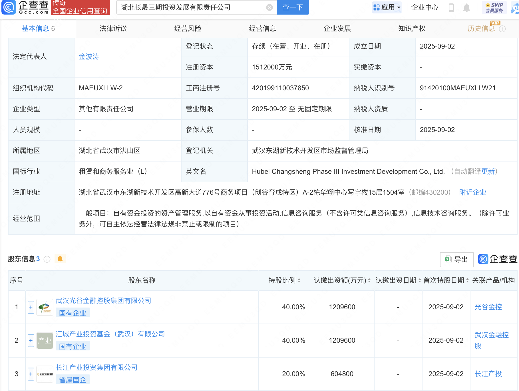 近日,湖北长晟三期投资发展有限责任公司成立,注册资本151.2亿元,经营范围包含:自有资金投资的资产管理服务;以自有资金从事投资活动;信息咨询服务(不含许可类信息咨询服务);信息技术咨询服务。企查查股权穿透显示证配所,该公司由武汉光谷金融控股集团有限公司等共同持股。