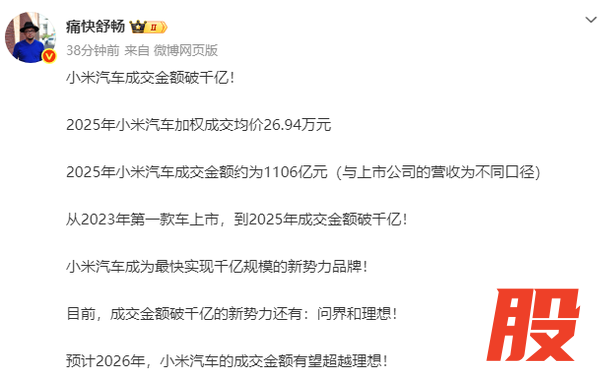 【CNMO科技消息】2月6日,有汽车博主透露,小米汽车在2025年的成交金额成功突破千亿大关,达到约1106亿元,加权成交均价为26.94万元。这一成就使小米汽车成为最快实现千亿规模的新势力品牌,与问界、理想共同跻身成交金额破千亿的新势力阵营。