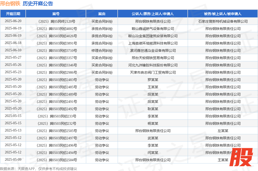 案号:(2025)冀05民终2120号审理法院:河北省邢台市中级人民法院案由:买卖合同纠纷当事人信息: 原告/上诉人:邢台钢铁有限责任公司 被告/被上诉人:石家庄普斯特机械设备有限公司开庭日期:2025年6月20日根据统计,近一年内以邢台钢铁有限责任公司为当事人的历史开庭公告有73则,其中案由为“劳动争议”的公告以39则居首,其次为“买卖合同纠纷”有21则,“承揽合同纠纷”有6则。历史开庭公告(前20条)如下: